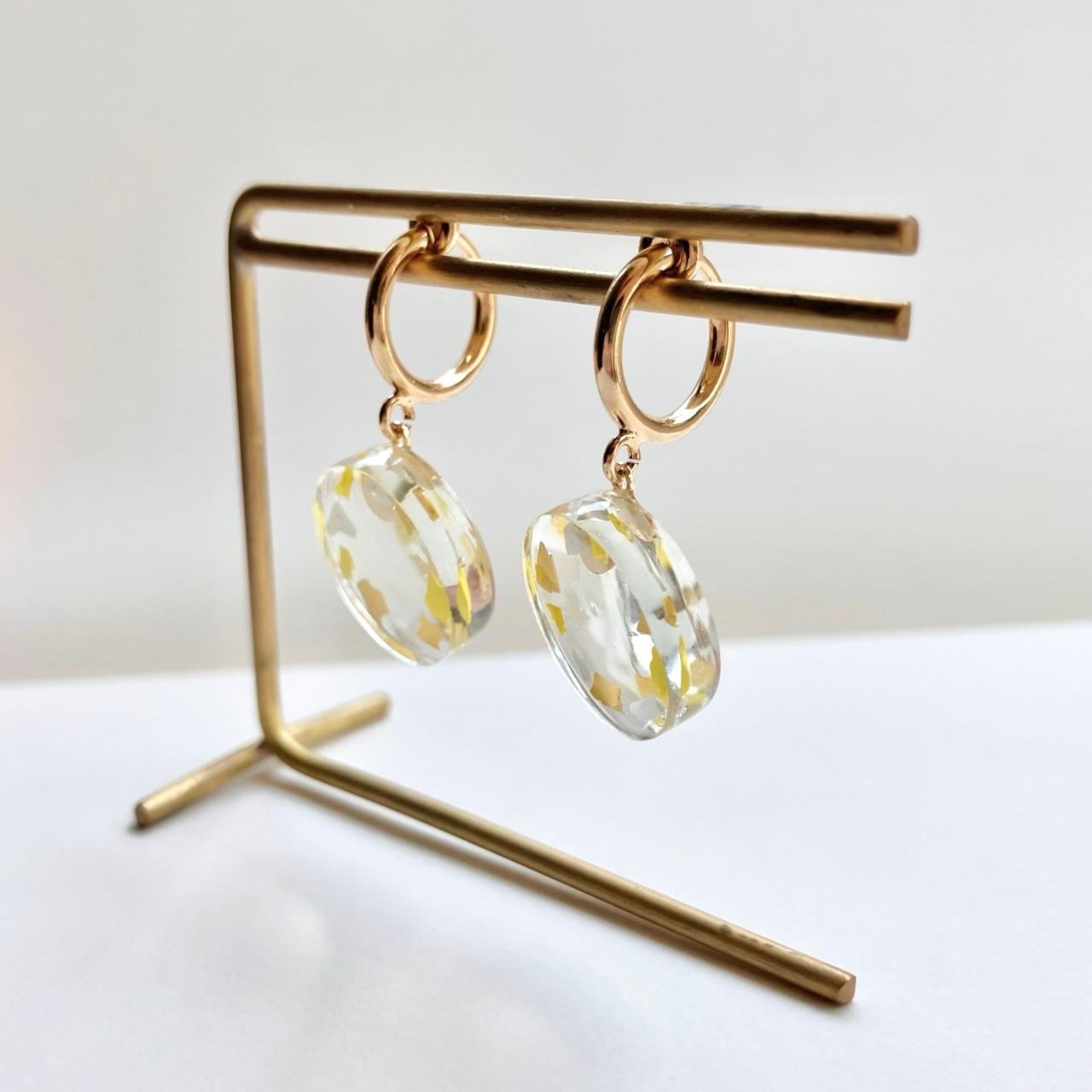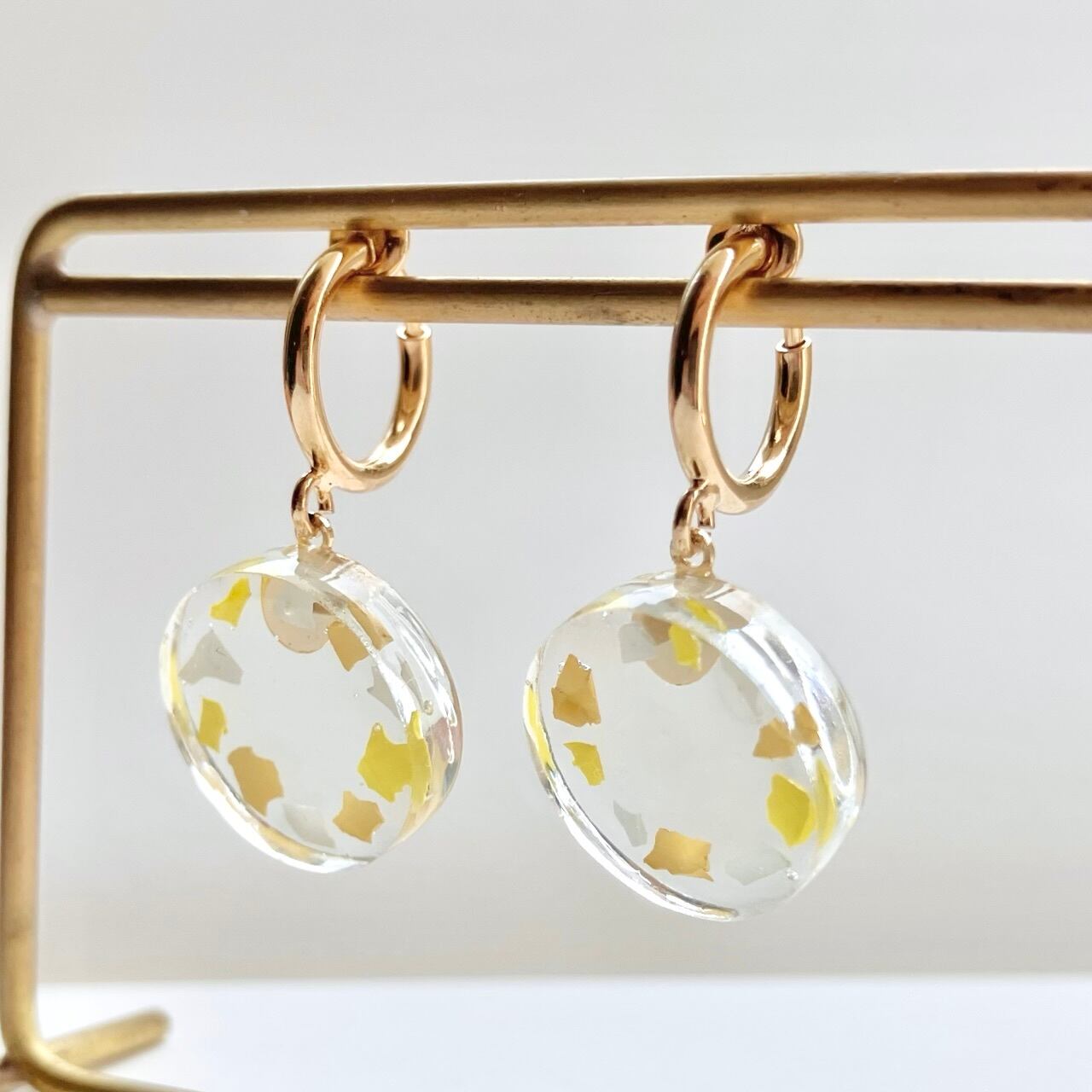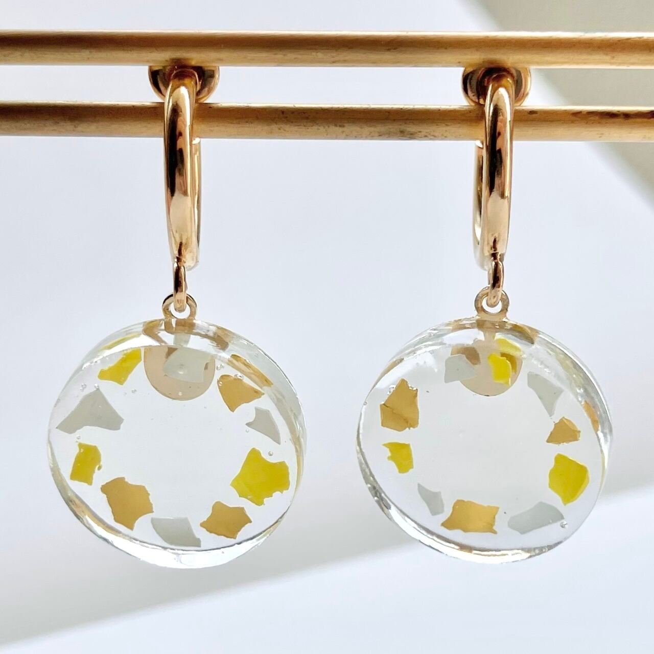 色のかけらをまるく並べて、ちょっと大人なフープイヤリングと合わせました✧