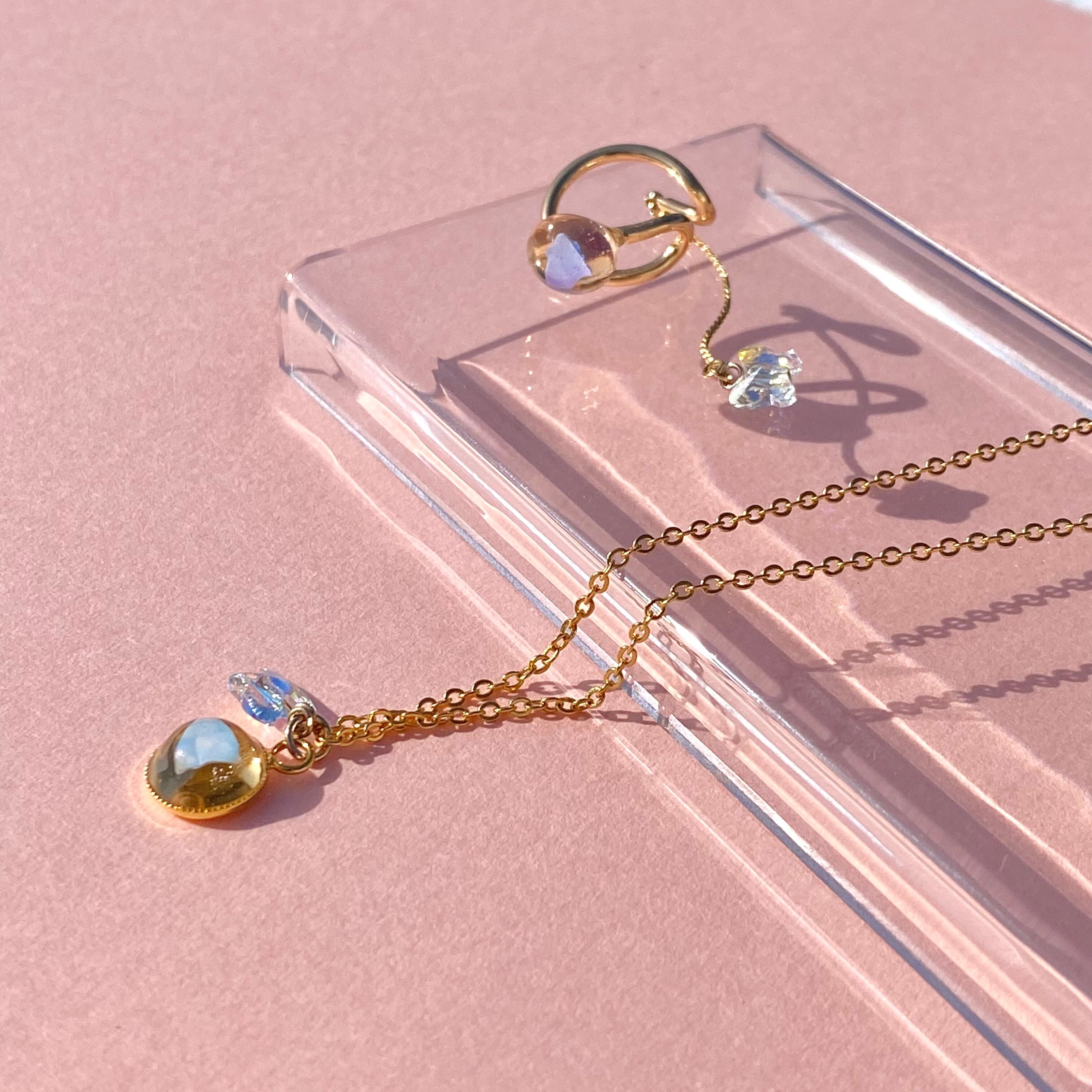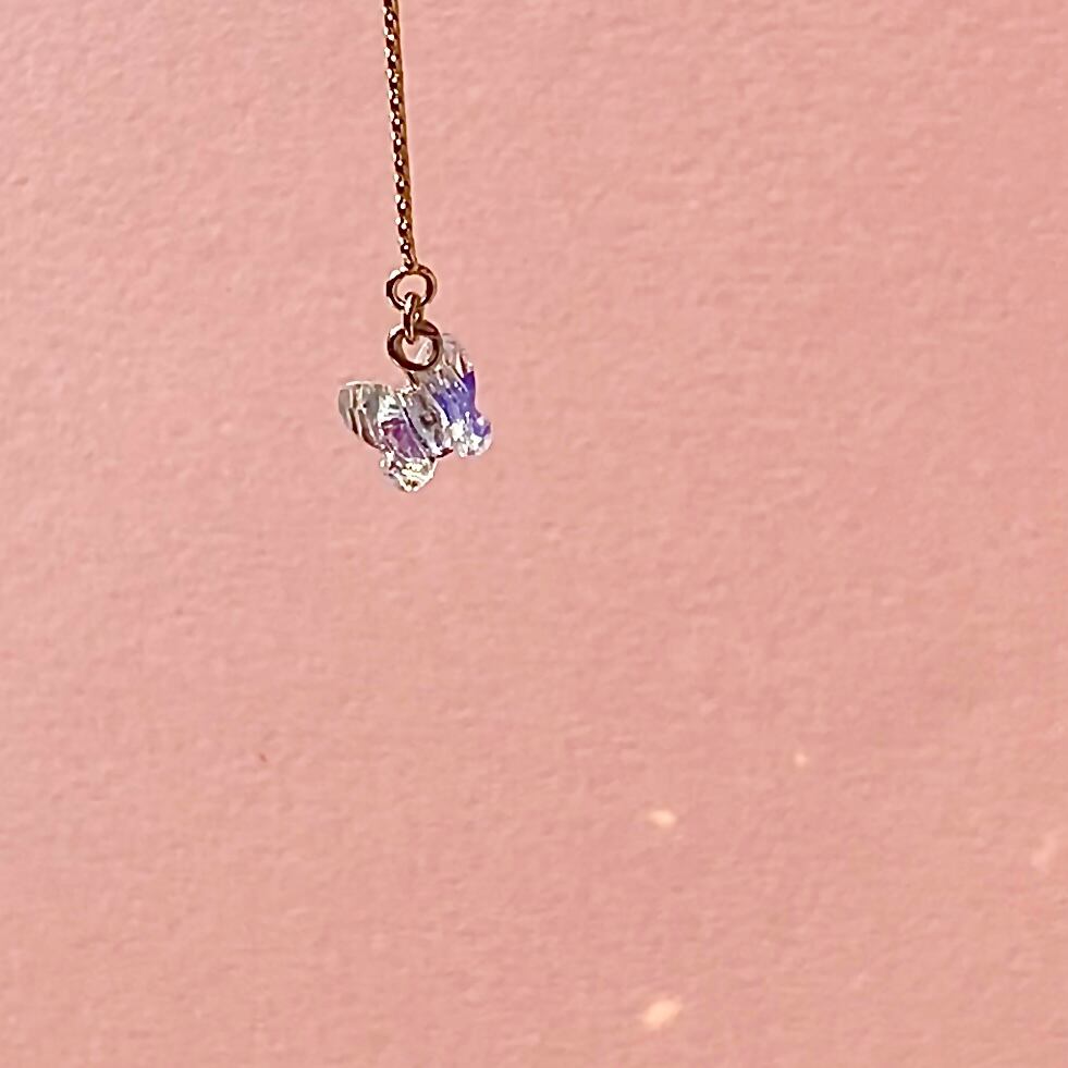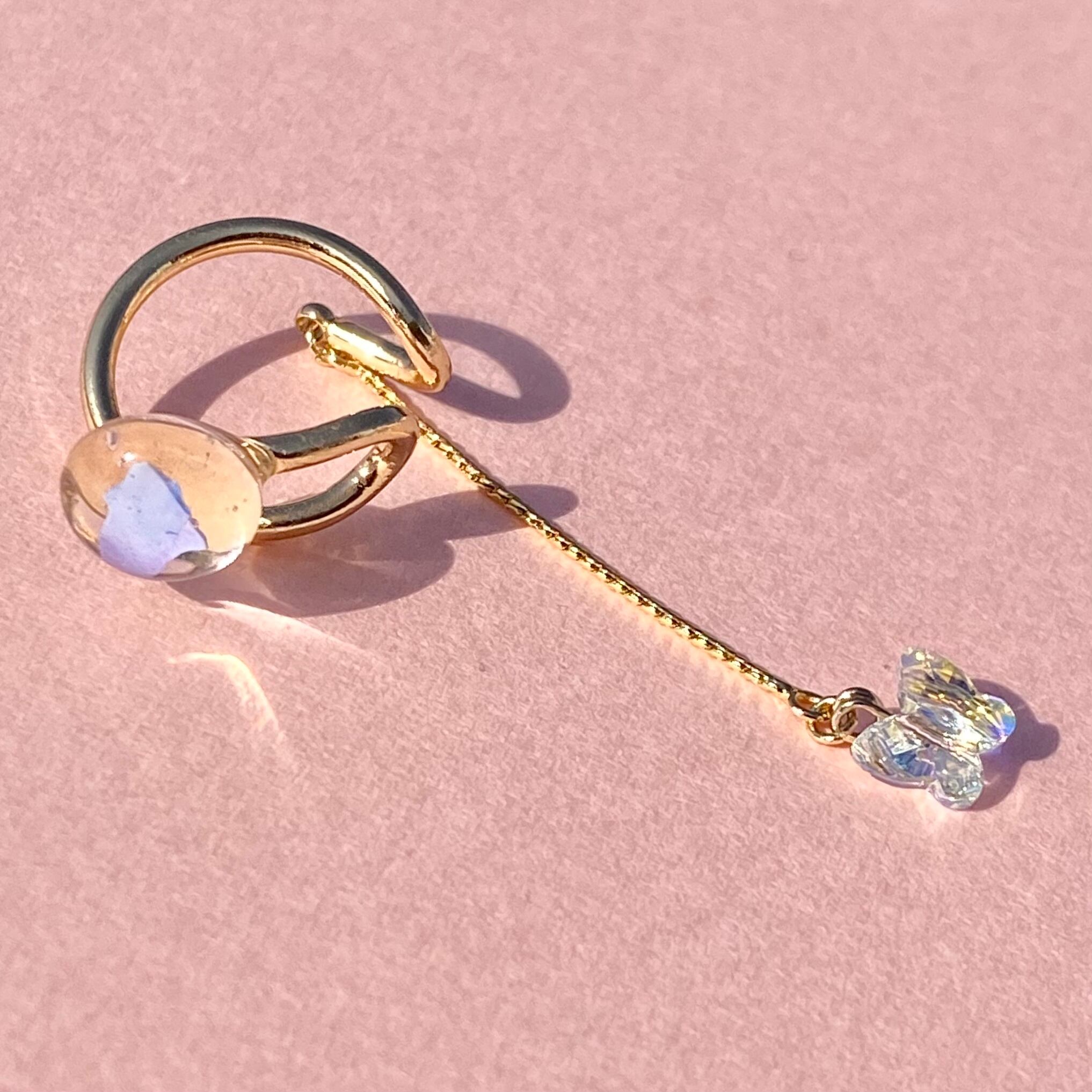 揺れる蝶々はクリスタル。甘いテイストもイヤーカフなら可愛すぎず、取り入れやすいです。