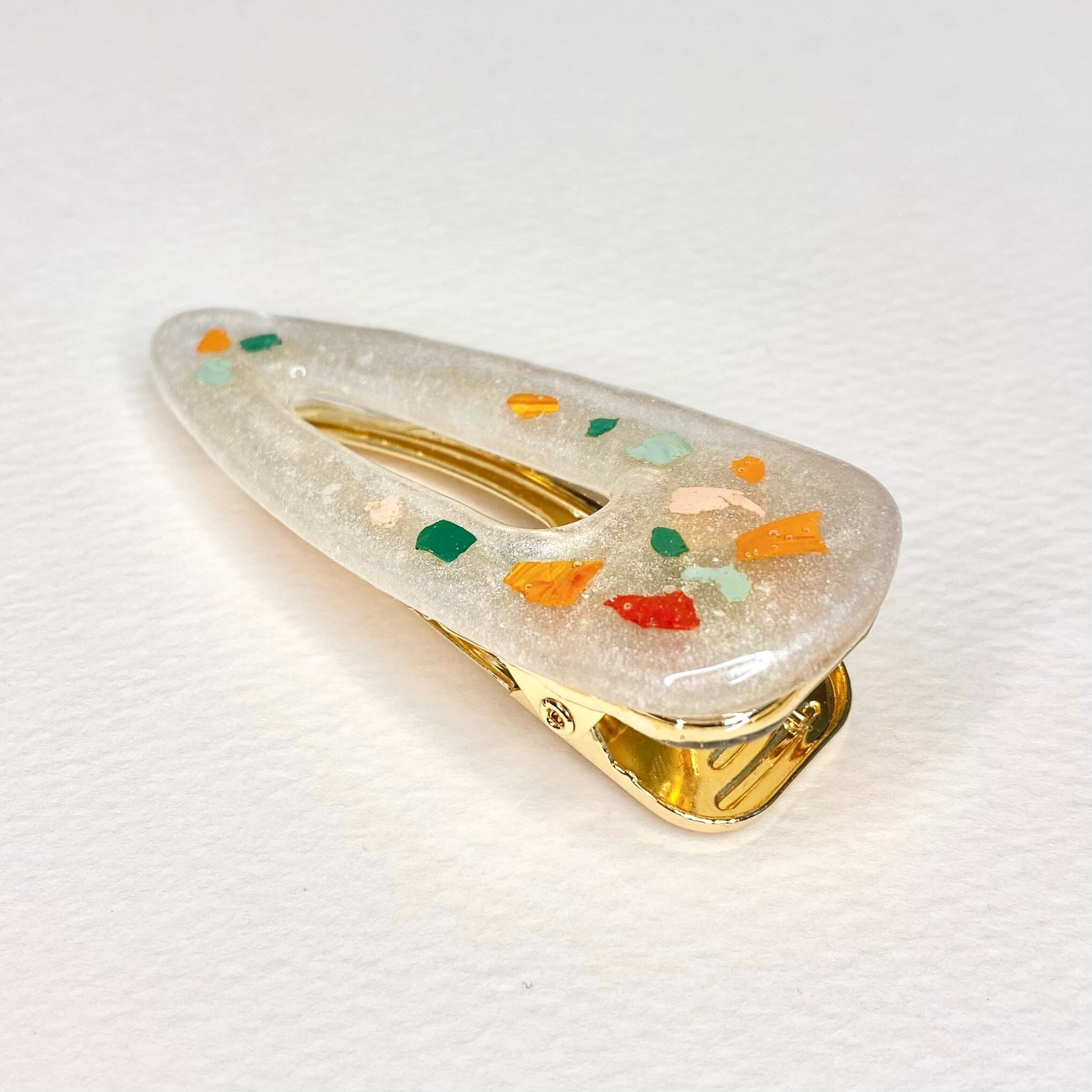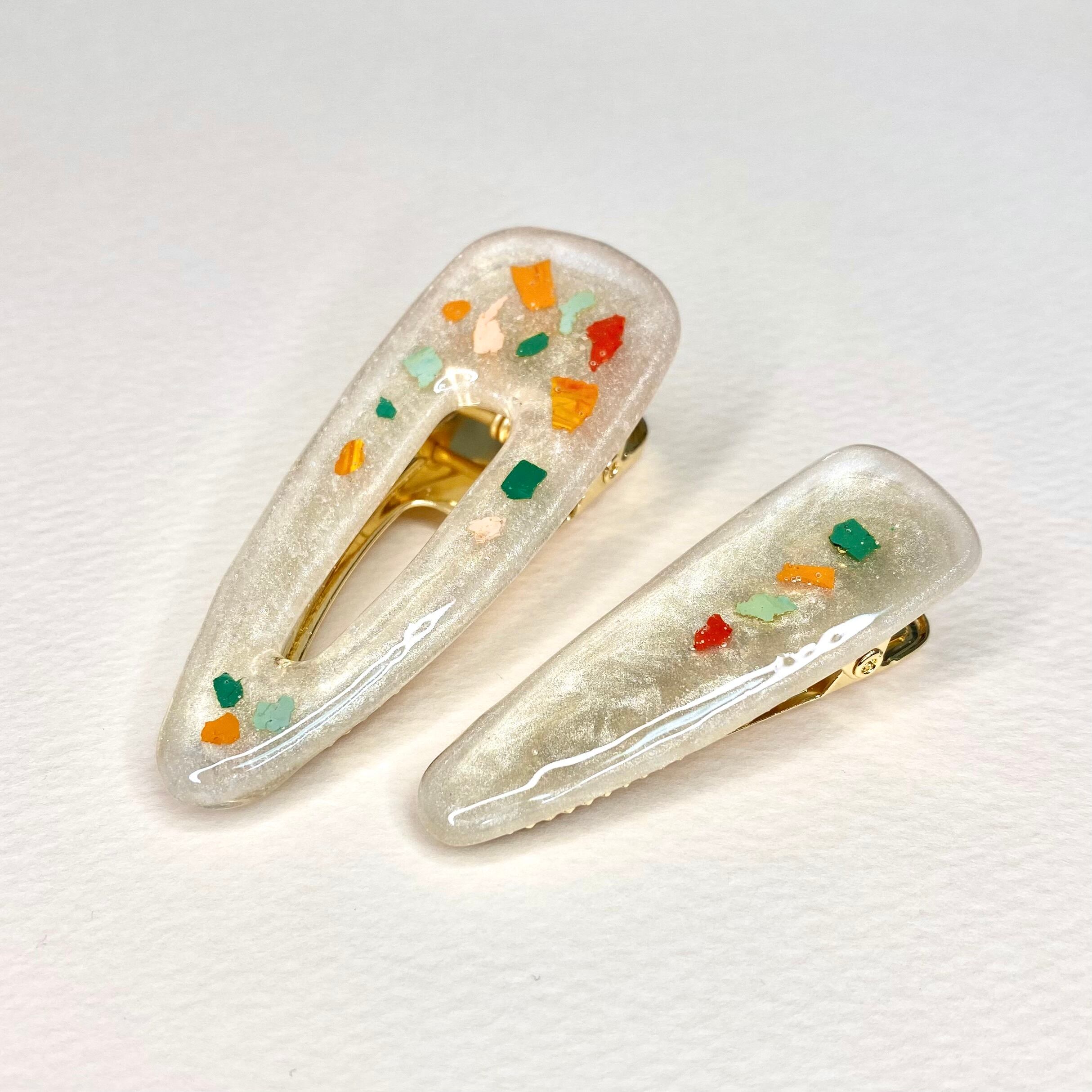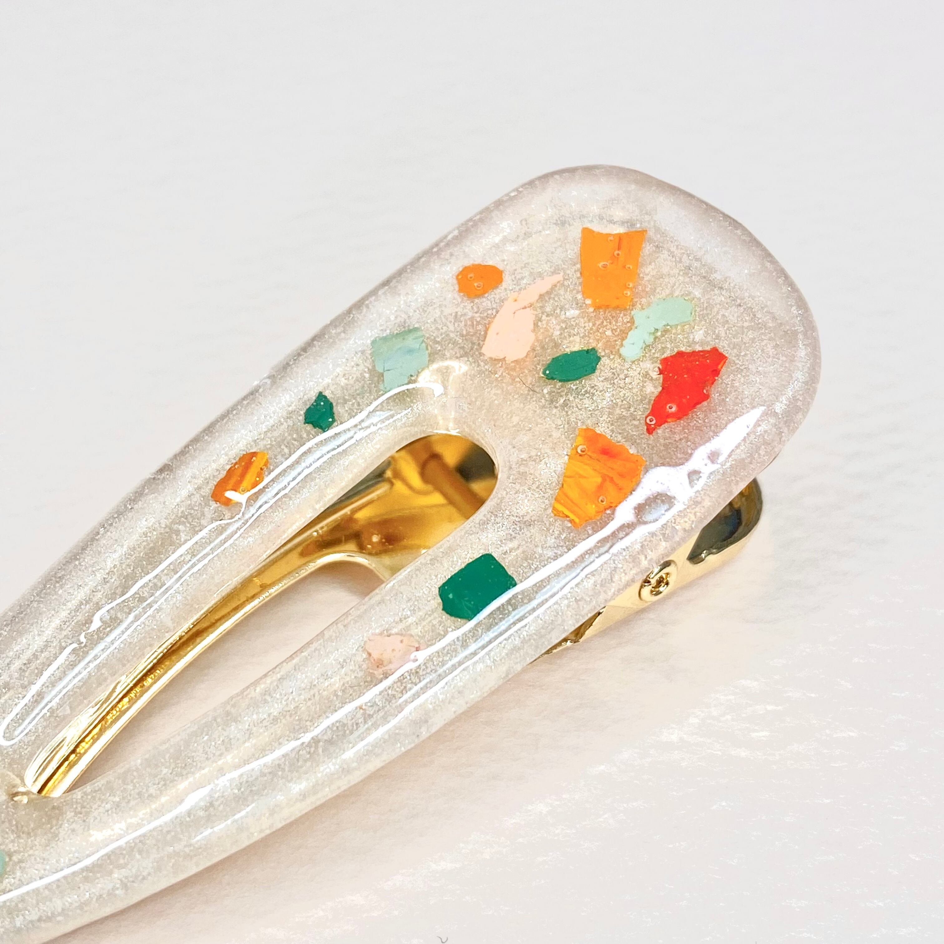 カラフルな「色のかけら」で、秋風がはこぶ金木犀のフルーティーな香りを表現しました(*^^*)ヘアクリップですが、ポケットにつけたりストールを留めたりしても可愛いです♫